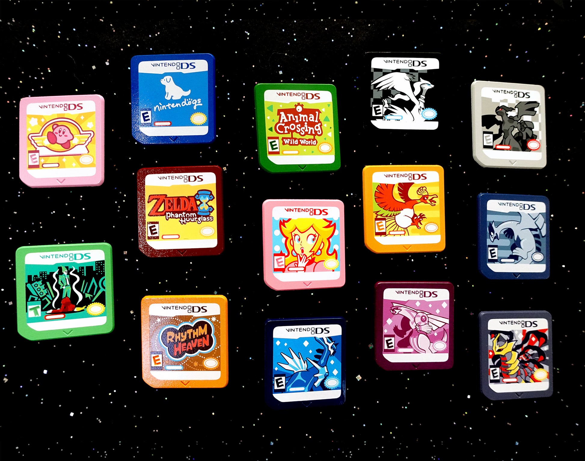 Part of a collection of dyed enamel pins representing some classic game titles!