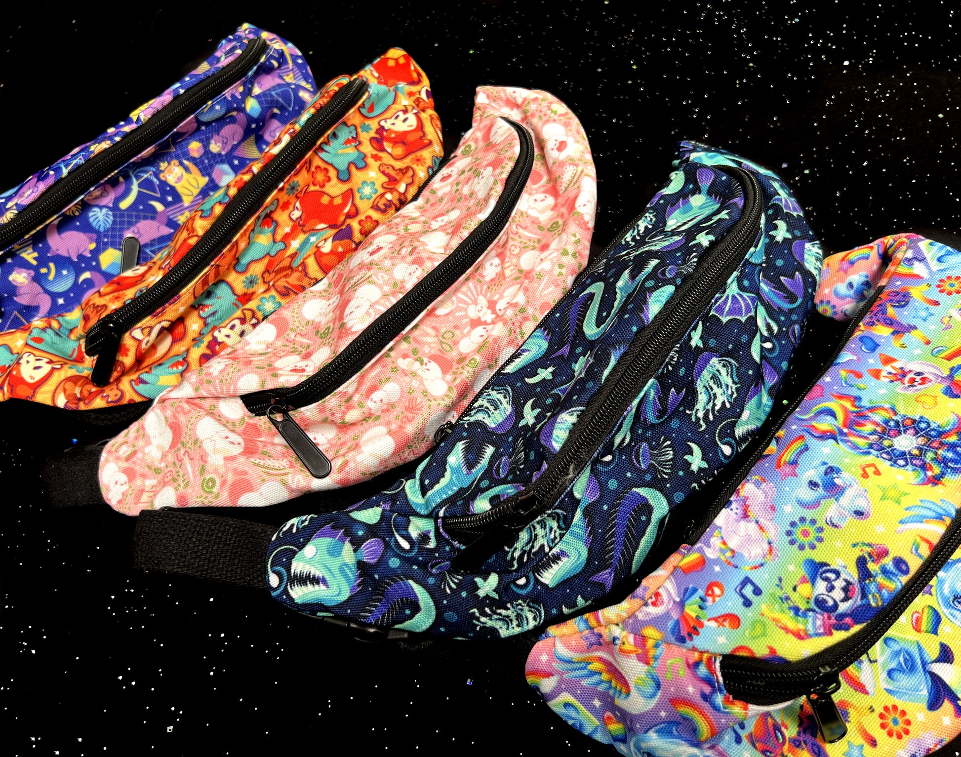 A collection of vibrant fanny packs, perfect for a wide range of outings and events!